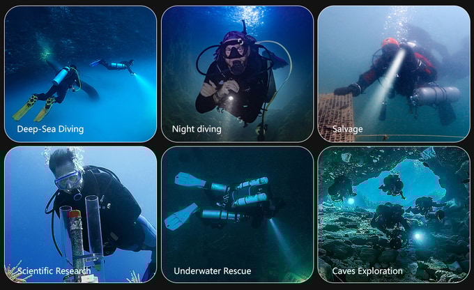 The smooth rotation ring allows divers to switch modes—High, Medium, Low, SOS, and Strobe—without removing gloves. Designed to resist high pressure and saltwater corrosion, it delivers consistent brightness and safety even during extended dives or deep-sea exploration.